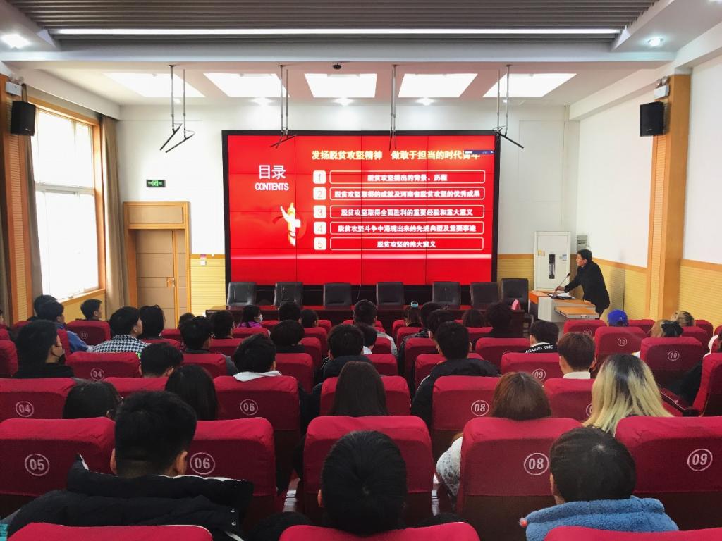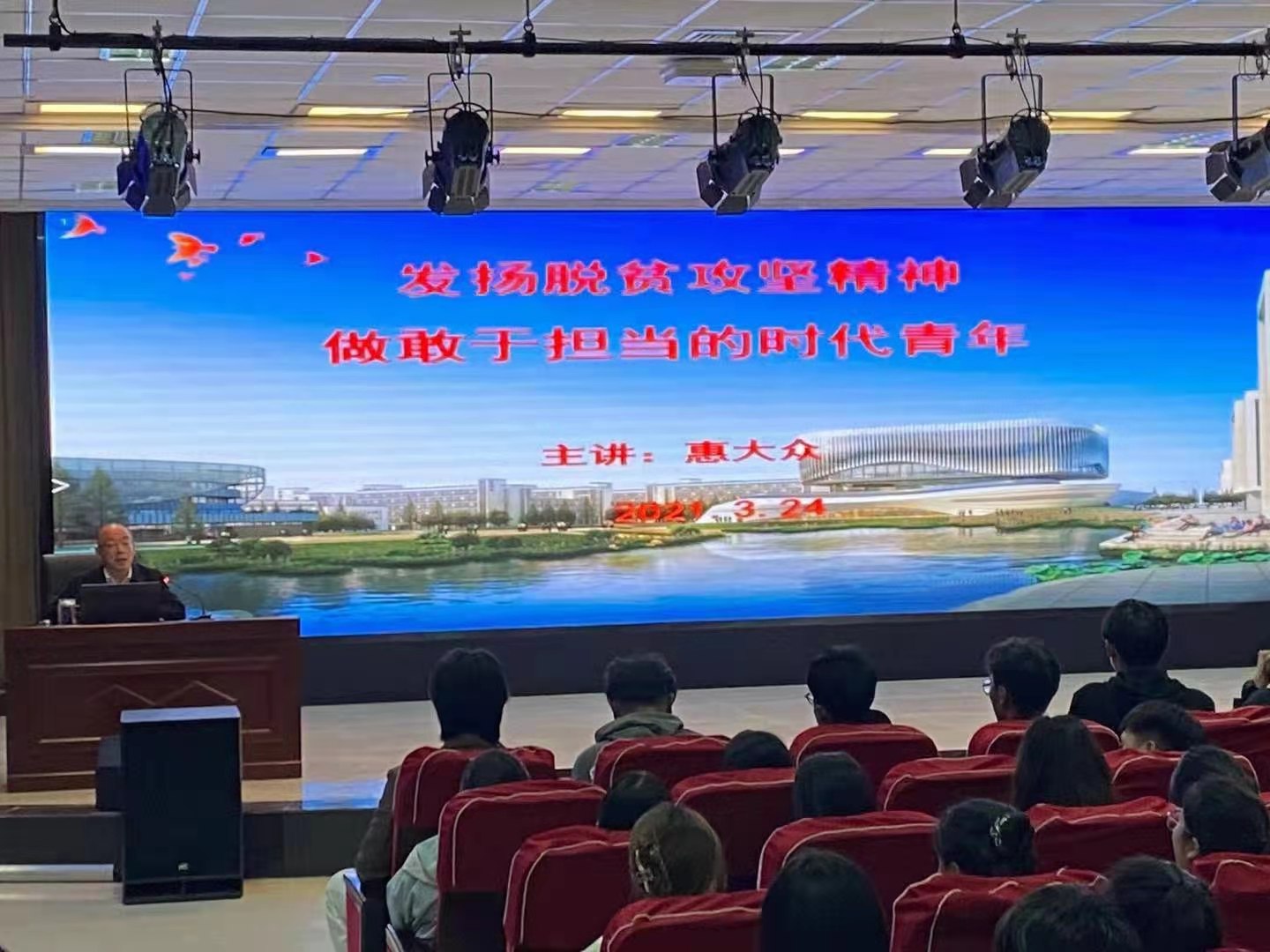 党委书记王立正围绕脱贫攻坚主题,在航空港校区德礼讲堂为水利工程系学生上了思政第一课。课上,他详细讲述了脱贫攻坚的提出背景、发展历程、取得成就、重要经验及其重大意义,要求与会学生要弘扬民族精神,积极向楷模学习,在为人民服务中茁壮成长,在艰苦奋斗中砥砺意志品质,在实践中增长工作本领,做敢于担当的时代好青年。