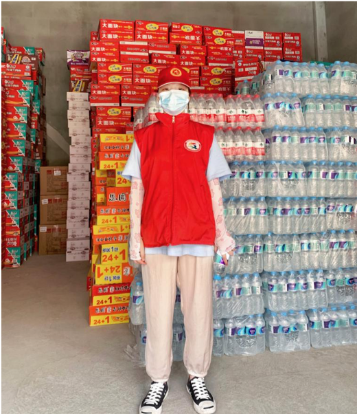 学生郭晓帆在鹤壁市浚县万邦物流中心参加物资搬运志愿服务活动。