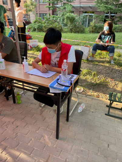 20级室内设计2班学生吴若楠在漯河市临颍县村民核酸检测点,协助医护人员进行场地消杀,帮助村民进行核酸检测线上预约,搀扶行动困难的老人。