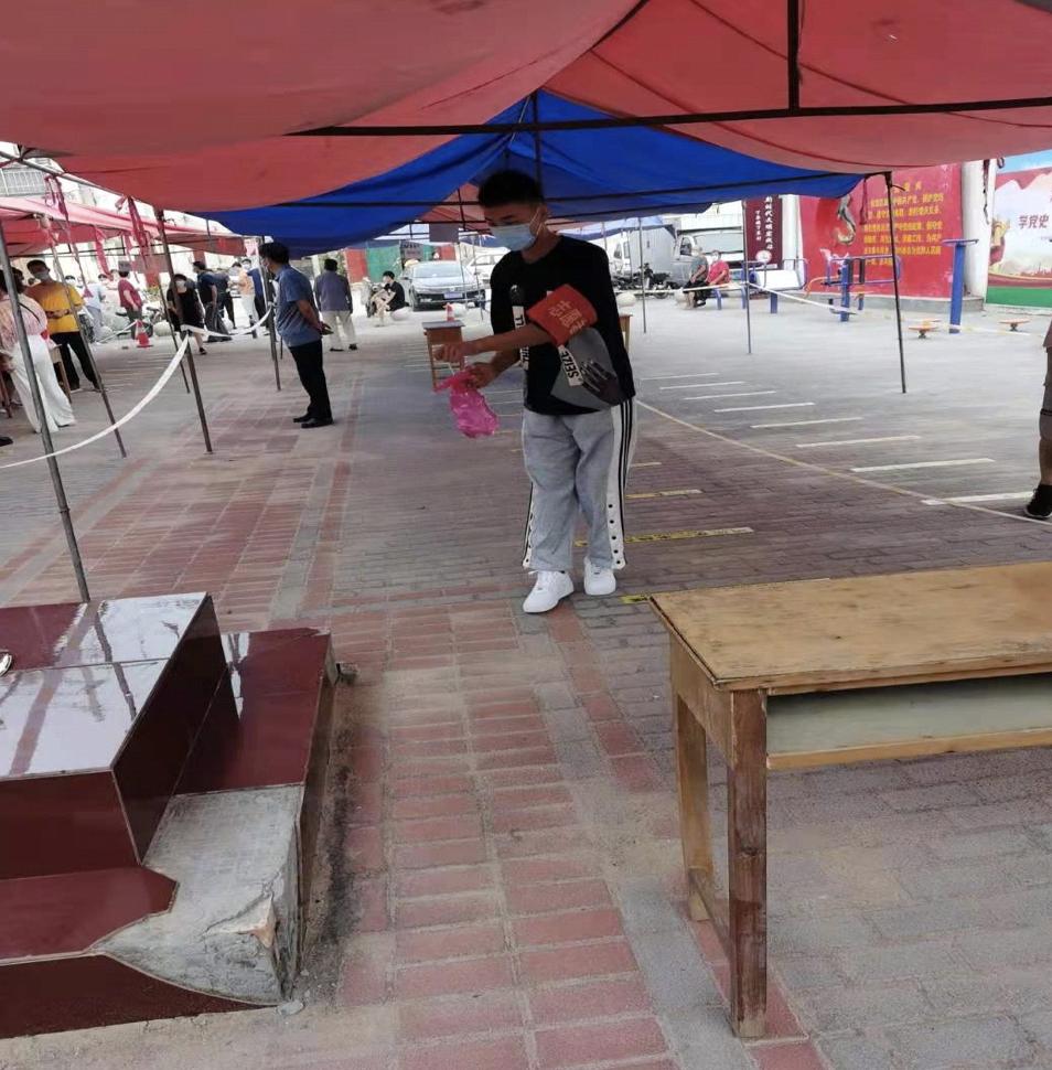 20级营销2班学生景雯倩协助医护人员完成核酸检测工作,并参与村口值班、扫码测温等志愿服务活动。