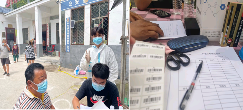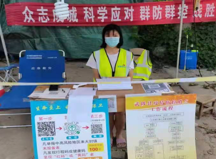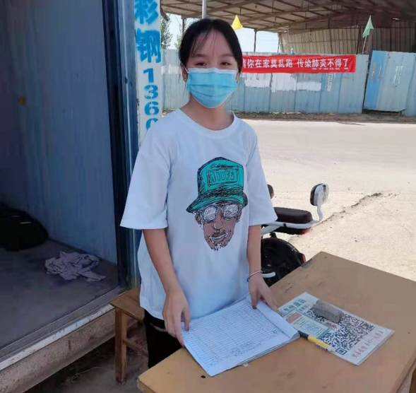 8月21日-23日,王宝睿在辉县市峪河镇毛庄村担任疫情防控志愿者,在村庄疫情防控卡点值班,对外来人员进行信息登记、扫码测温,并参与村庄的日常消毒工作。她说:“面对严峻的疫情形势,作为一名当代大学生,我有义务担当起疫情防控的责任,与家乡人民勠力同心,抵御疫魔。”