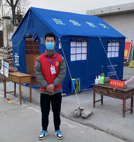 2020级水工1班张浩在鲁山县露峰街道办事处协助做好体温测量、往来车辆登记等工作。他说:“即使天气寒冷,我也没有退缩,依然坚守岗位,认真完成疫情防控志愿服务工作。”