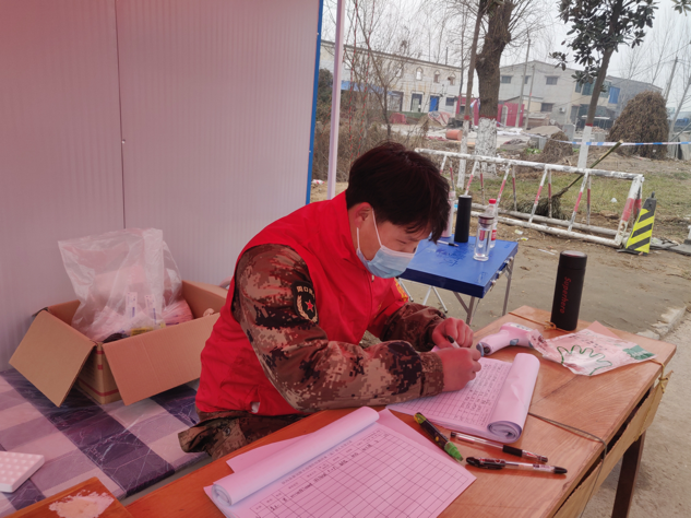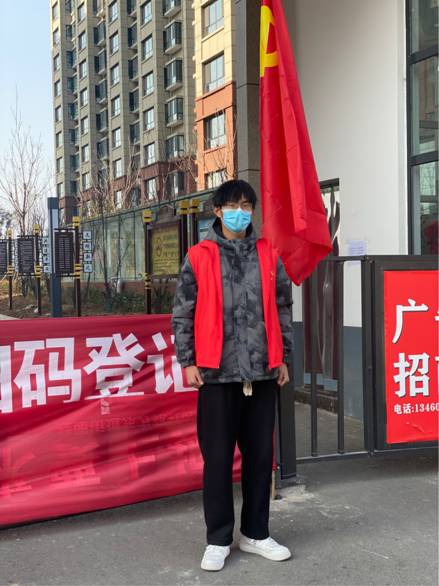 2020级机电1班学生李泰桦在汝州市西西社区防疫卡点参加疫情防控志愿工作,负责来往车辆及人员的信息登记、测量体温等。他说:“作为青年志愿者,尤其在疫情期间,没有一个人可以置身事外,疫情防控不分国界、不分你我!”