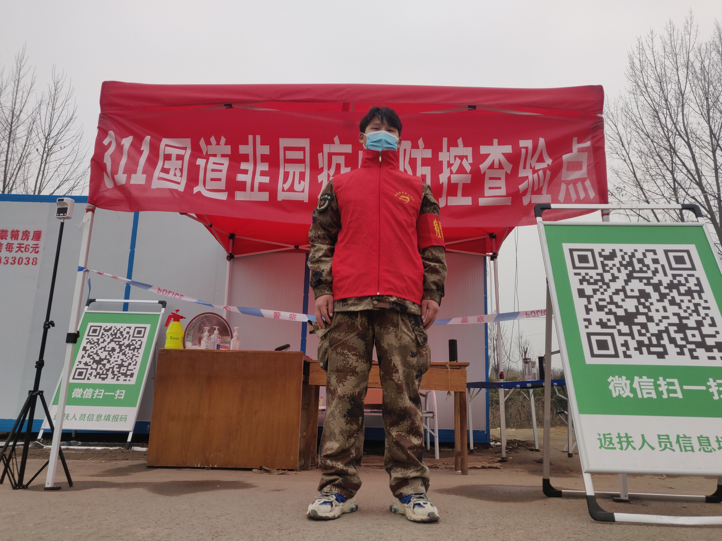 1月8日至2月1日,2021级机电1班学生刘俊岐在周口市扶沟县韭园镇311国道疫情防控查验点参与志愿服务工作。他说:“抗击疫情,从我做起。我们要有自信,一定会取得胜利!”