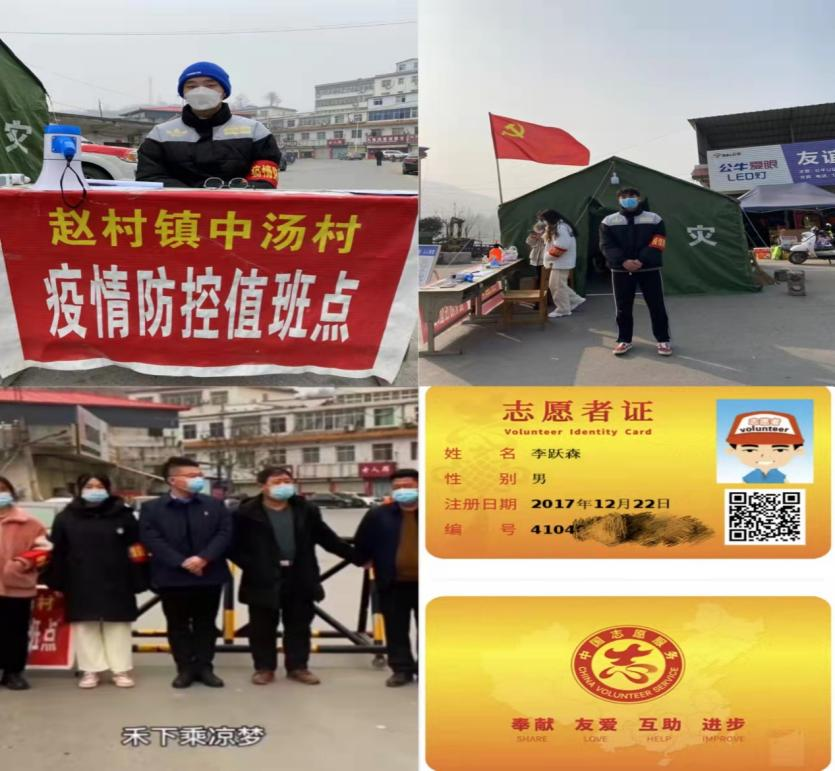 家住平顶山市鲁山县赵村乡中汤村的2021级机械-工程师1班学生李跃森,主动参加家乡疫情防控志愿活动,挨家挨户为社区及街道居民普及疫情防控知识,引导大家少出门,加强个人防护;并在多个防控点对来往车辆进行登记,排查流动人员信息、测量体温。他说:“我希望中国能够快速战胜疫情,希望中国人民平安快乐,中国加油!中国必胜!”