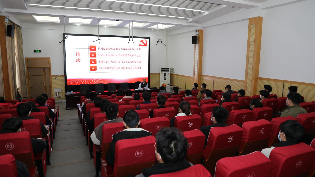 王立正详细解读了党的十九届六中全会审议通过的《中共中央关于党的百年奋斗重大成就和历史经验的决议》,就深刻把握“两个确立”的重大意义和实践要求、全面领会“党史上的四大历史时期、四大历史任务、‘四个伟大成就’”等重点内容进行了精彩讲述。他强调,全体师生要深刻领悟“两个确立”的决定性意义,切实把“两个确立”转化为做到“两个维护”的思想自觉、政治自觉、行动自觉;要加强政治理论学习,用党的创新理论武装头脑,弘扬和践行社会主义核心价值观,从时代进程中把握时代使命,锻造能力本领,争做新时代的奋斗者。