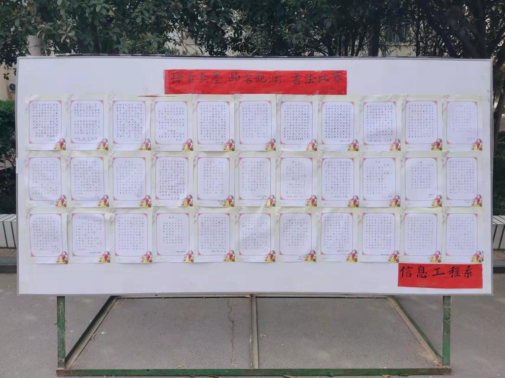 为丰富校园文化生活,3月28日-4月3日,信息工程系开展“弘扬传统文化,展笔墨风采”书法比赛。比赛分为硬笔书法和软笔书法两个项目,共收到400余份作品。经过初赛和复赛,最终评选出硬笔书法一等奖3名,二等奖5名,三等奖9名;软笔书法一等奖1名,二等奖2名,三等奖3名。