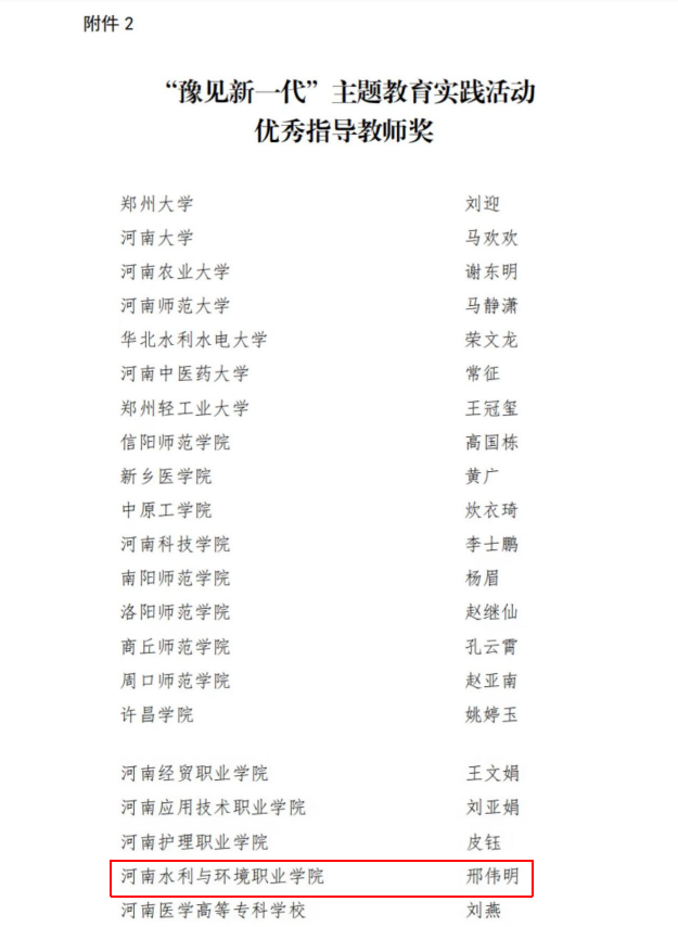 近日,省教育厅公布“豫见新一代”主题教育实践活动获奖结果,我校环境工程系教师邢伟明荣获优秀指导教师奖。