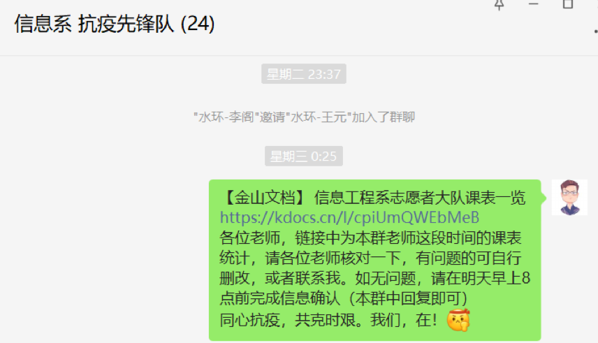 “我们需要赶紧做出一张先锋队里所有老师的课表统计,便于我们在后续工作中,能够快速组织有效人力。”5月4日凌晨,系主任张军锋在确保先锋队员全员到岗后,统筹安排具体工作内容。“我来,做个线上表格,老师们核对完后,咱们都可以随时查看,表格也能及时更新。”抗疫先锋队的群在5月4日凌晨,便开始发挥阵地作用。