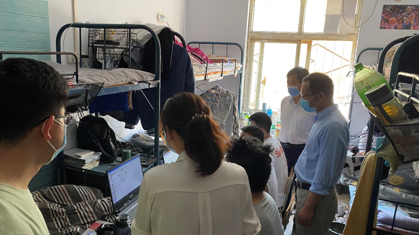 辅导员张豪、陈琛、黄妍闻、王真、王尧进入宿舍查看学生学习情况