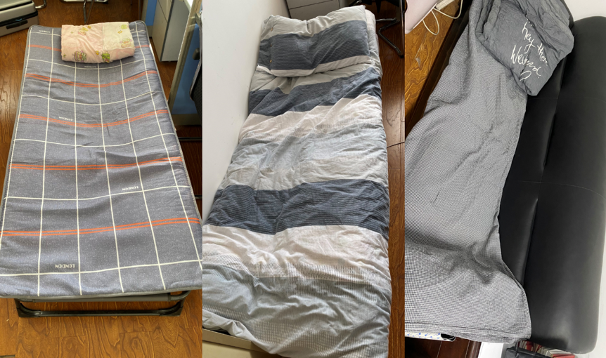 教师刘敬坡、王嘉浩、沙昉奕在办公室中临时搭的床铺