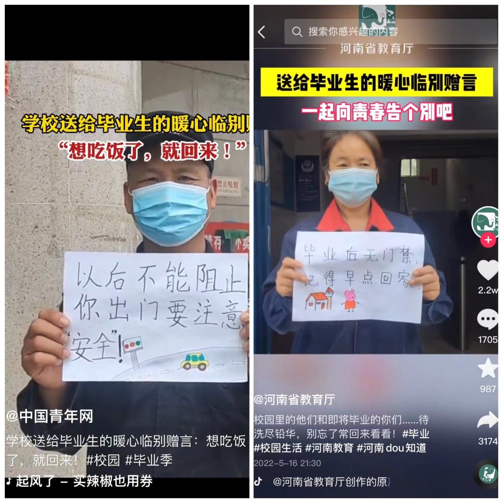 视频记录了学校食堂、安保等后勤人员对毕业生的句句叮嘱,展现了水环大家庭的温情。