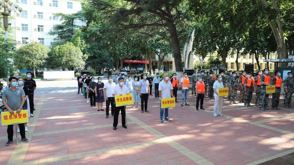 防汛演练人员分为信息预警组、学生疏散组、安全警戒组、综合保障组、应急抢险组五个小组,演练内容包括快速集结、转移学生、封堵抢险、应急排水四个方面。演练中,我校防汛指挥决策准确、规范,调度灵活、科学,各部门对意外突发事件的快速反应能力和后勤保障工作到位,应急预案的可操作性合理,取得了圆满成功。