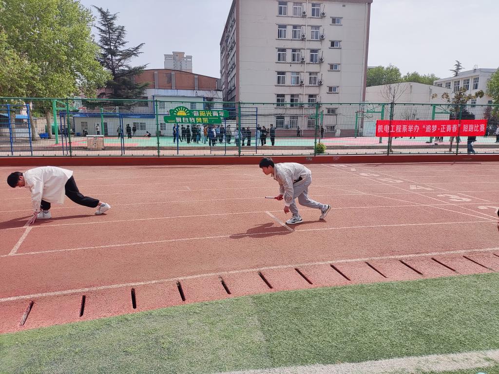 为鼓励同学们积极备战,轻松上阵,以良好的精神状态迎接校运动会,4月9日,机电工程系举办“追梦正青春”4x100米接力比赛。