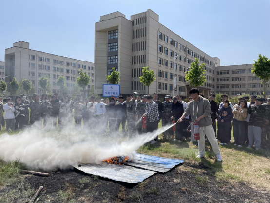 在扑救初起火灾演练环节,苏洋向师生介绍了如何判断火灾情况、初起火灾时如何使用灭火器灭火,着重讲解了灭火器的使用操作规范和适用场景。师生踊跃参与,实际操作灭火器扑灭模拟的火情。