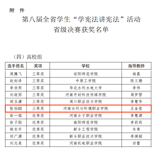 10月18日,河南省教育厅公布了第八届全省学生“学宪法 讲宪法”活动总决赛获奖名单,我校2022级水工3班学生张怡銘在比赛中获得三等奖。