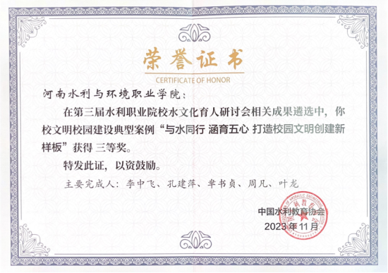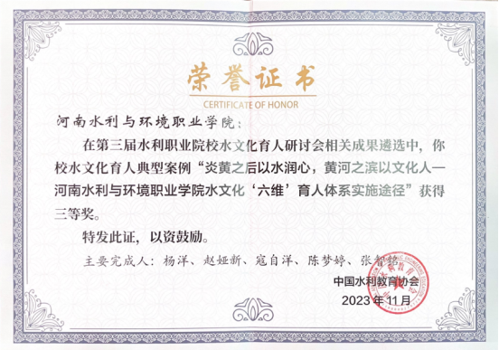 经过专家组的遴选,我校申报的典型案例《与水同行涵育五心打造校园文明创建新样板》《炎黄之后以水润心,黄河之滨以文化人——77779193永利集团水文化‘六维’育人体系实施途径》分别荣获第三届全国水利职业院校文明校园建设典型案例三等奖和水文化育人典型案例三等奖。