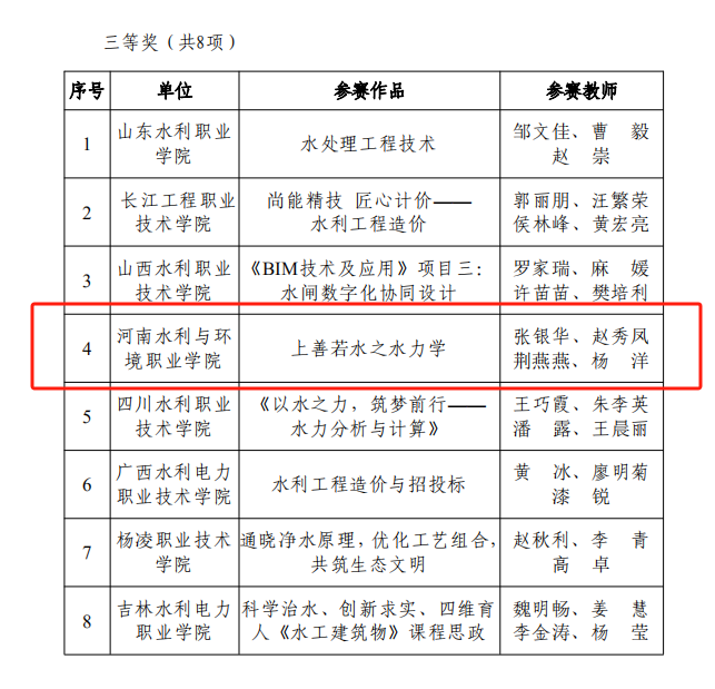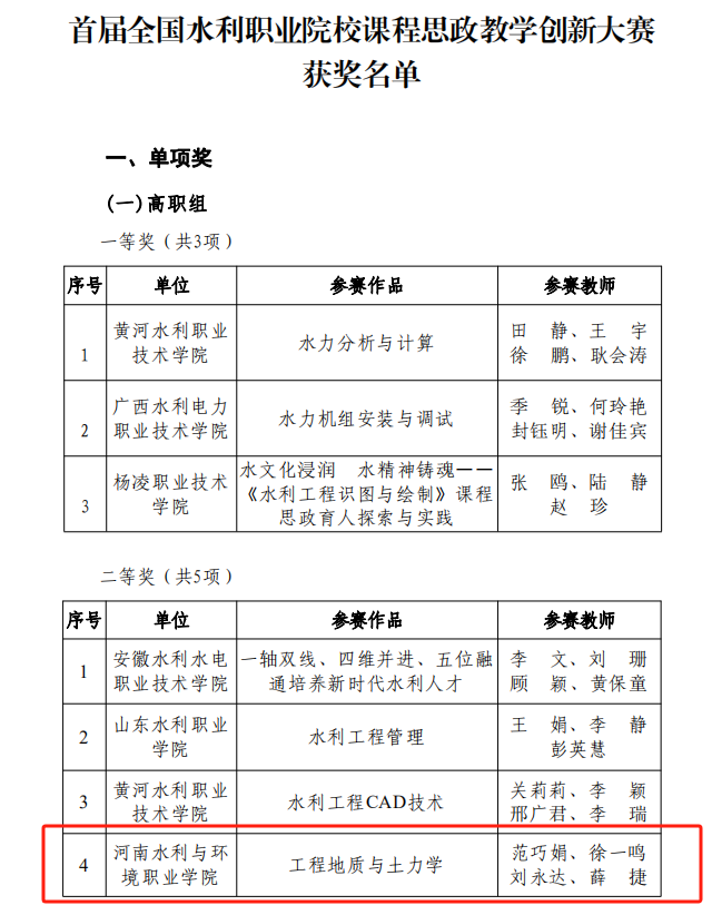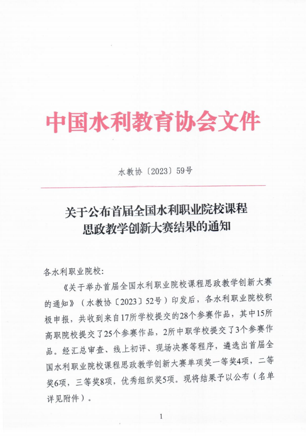 12月29日,中国水利教育协会下发《关于公布首届全国水利职业院校课程思政教学创新大赛结果的通知》水教协〔2023〕59号,我校参赛作品《工程地质与土力学》和《上善若水之水力学》分别获得高职组二等奖、三等奖,学校荣获优秀组织奖。