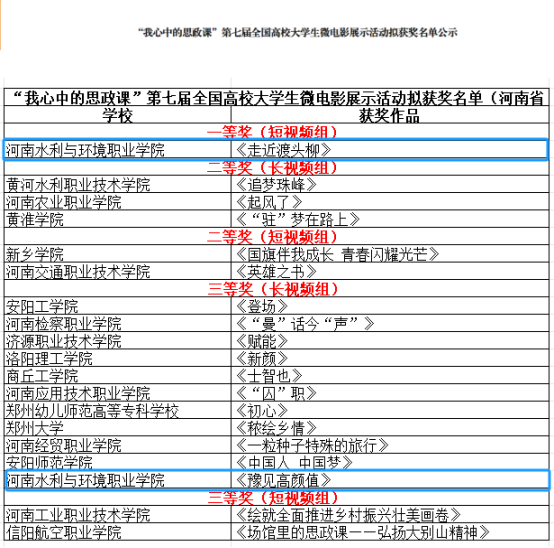 本次活动共评选出特等奖作品17项、一等奖作品50项、二等奖作品99项、三等奖作品166项;单项奖7项。其中,河南高校斩获一等奖1项,二等奖5项,三等奖13项。我校推荐的作品《走近渡头柳》是河南省唯一一个一等奖的获奖作品,我校是唯一一个获得2个奖项的高职院校,这是我校在思政课建设上取得的重大突破。