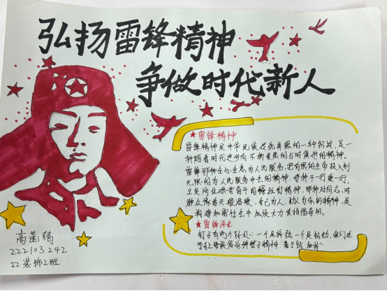 “雷锋精神永相传”手抄报活动中,同学们以雷锋肖像、雷锋故事、雷锋精神、《雷锋日记》语录、身边学雷锋的事迹等为素材,通过绘画、摘录等方式,用一字一句、一诗一画,绘雷锋故事,扬雷锋事迹。