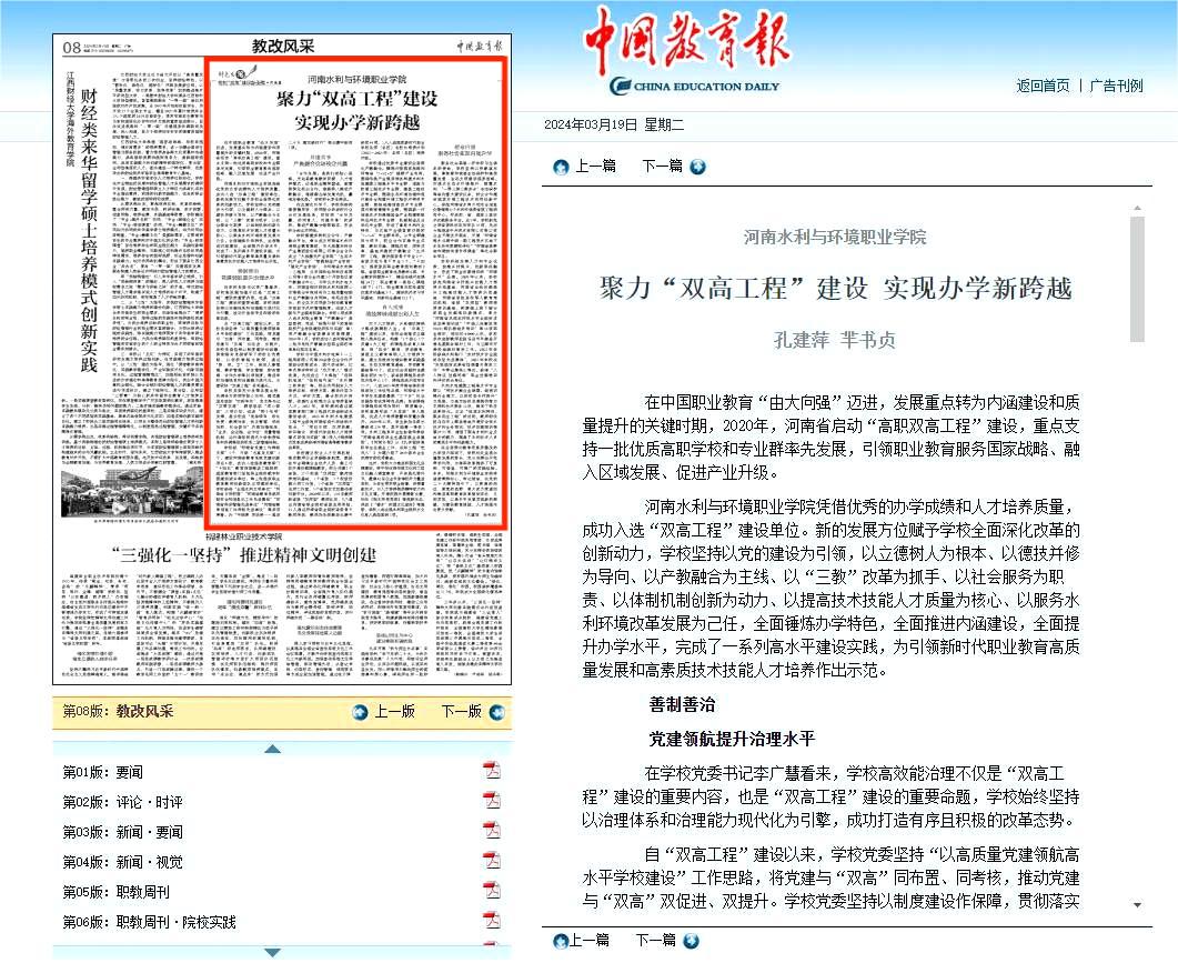 2024年3月19日,《中国教育报》刊载文章《77779193永利集团:聚力“双高工程”建设 实现办学新跨越》,从“善制善治 党建领航提升治理水平”“共建共享 产教融合促进校企共赢”“育人成果 德技辉映成就出彩人生”“使命价值 服务社会实现自我升华”四个方面对我校办学成果进行了报道。