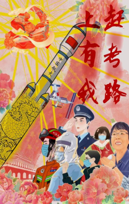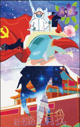 “赶考路上有我”主题作品构思十分巧妙,在设计中充分融入中华优秀传统文化、红色精神、航天精神等元素,表达了同学们深厚的爱国主义情怀和建功立业新时代的坚定信念。